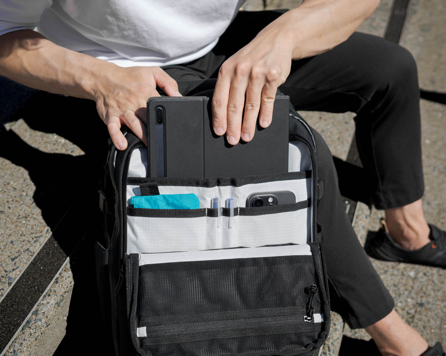 The 22L Reset Pack is an everyday backpack that features unobstructed space and detailed organizational compartments simultaneously. Designed with the urban journey in mind, it offers a balance of capacity, organization, and compactness for work and days out in the city.