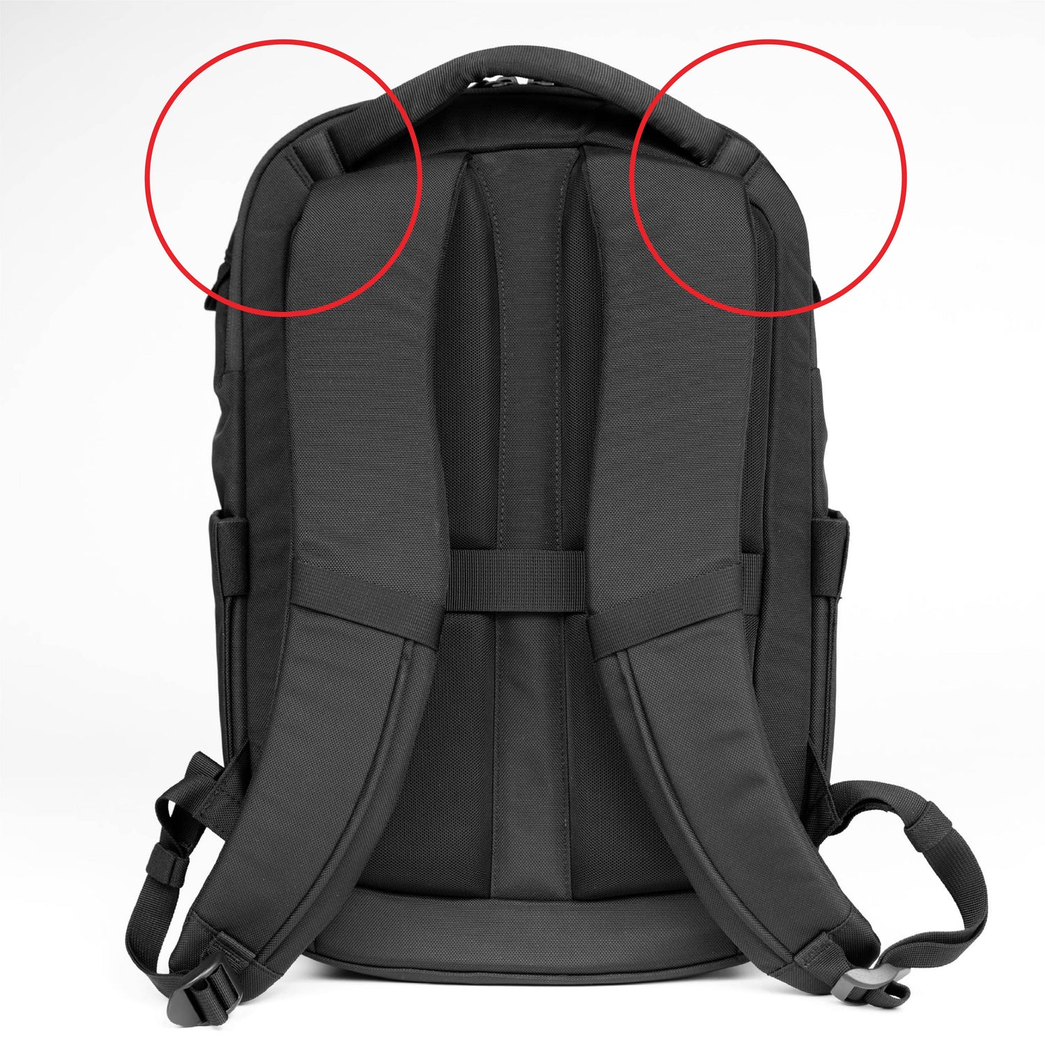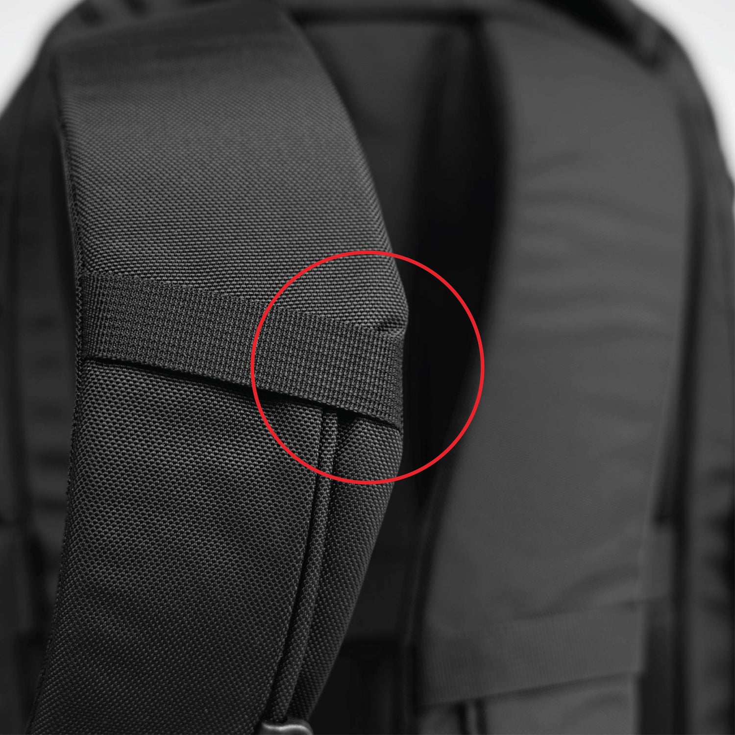 - Slight bunching of the fabric on the left shoulder strap, near the webbing lash point.