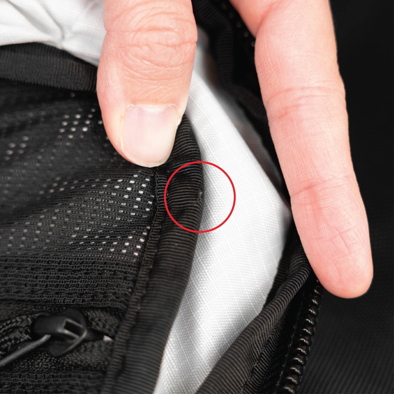 - Small punctures in the hypalon zipper pull tabs on the right side of the ambidextrous pocket.