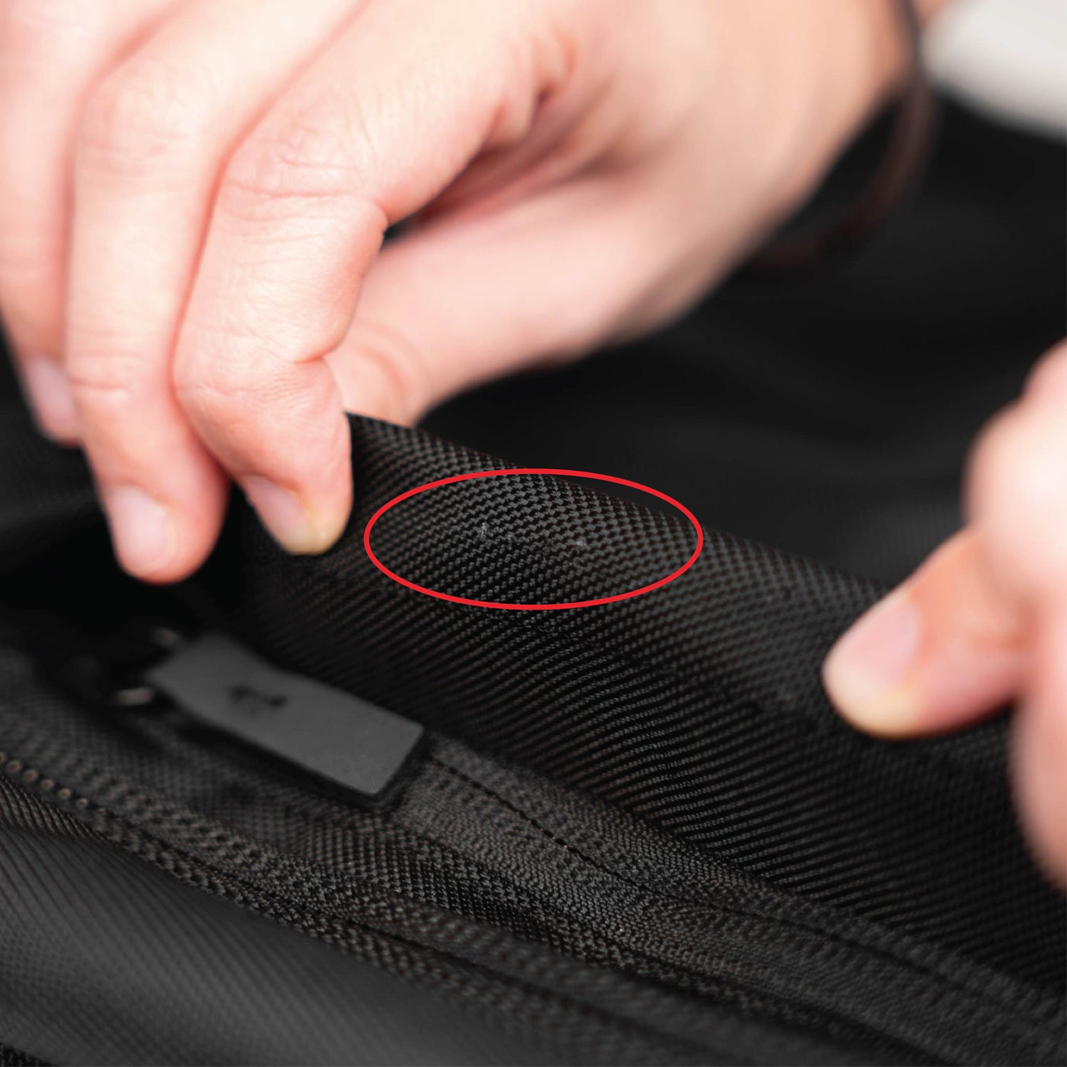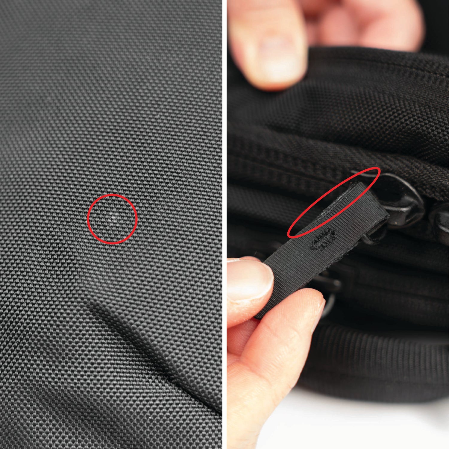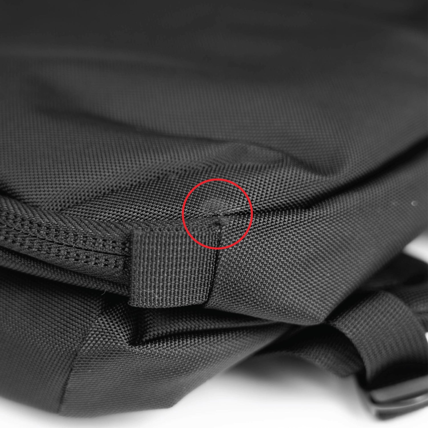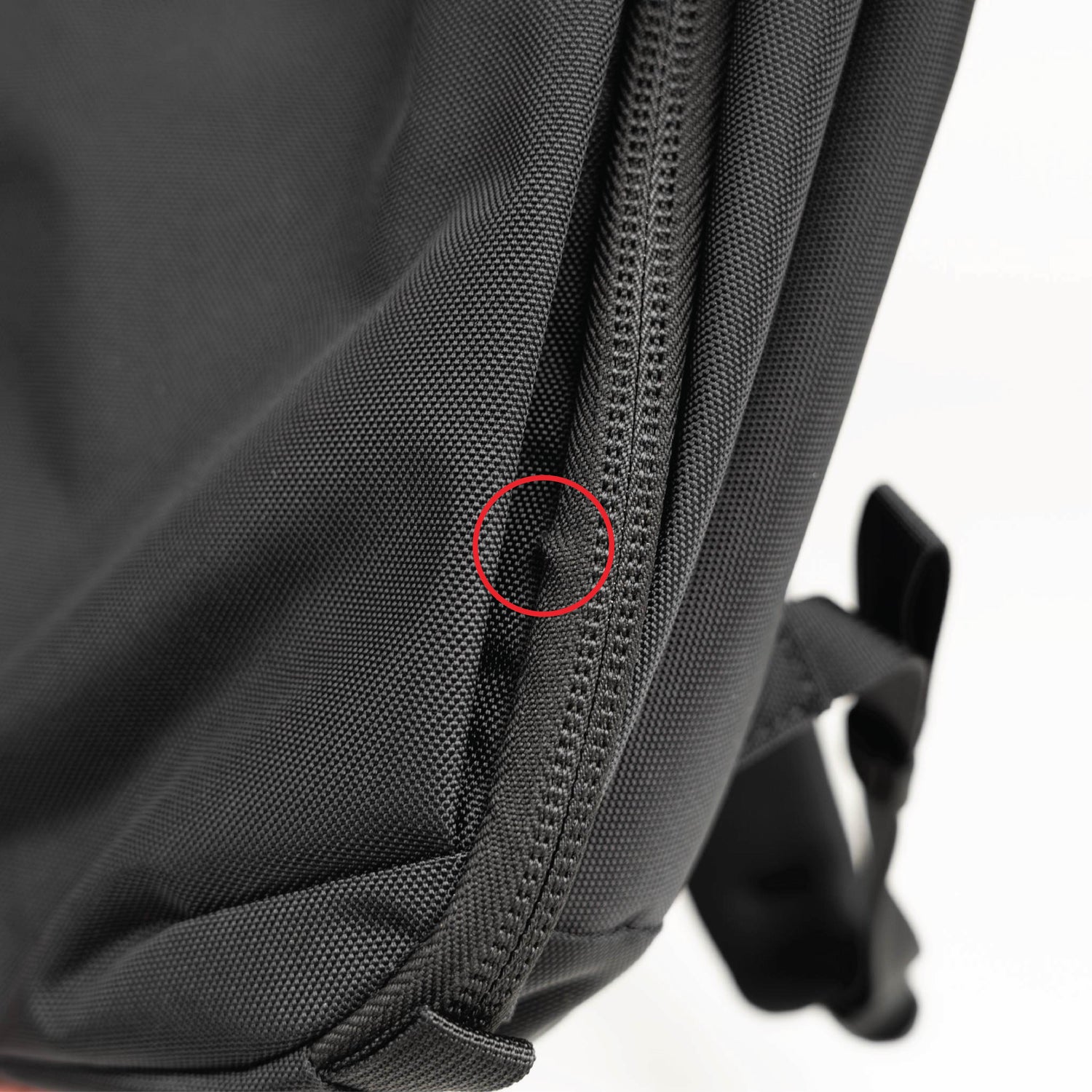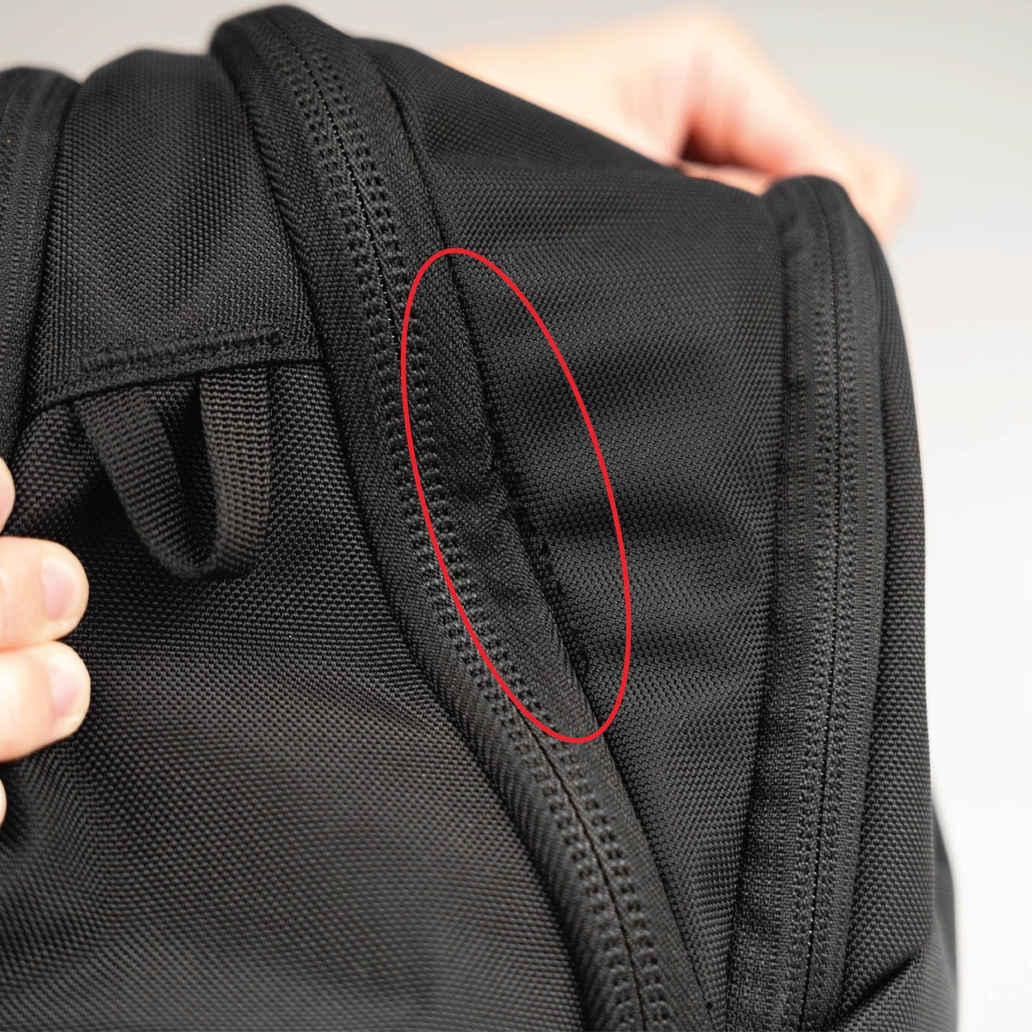 - Frayed stitches on the left side of the main compartment zipper track