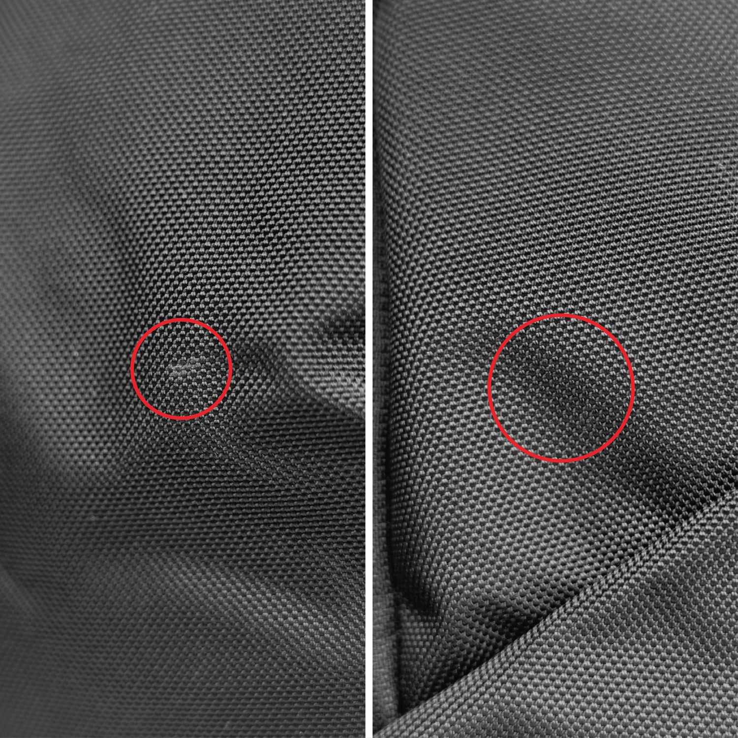 - Abrasion and fraying on the main fabric on the left-side ambidextrous pocket.
