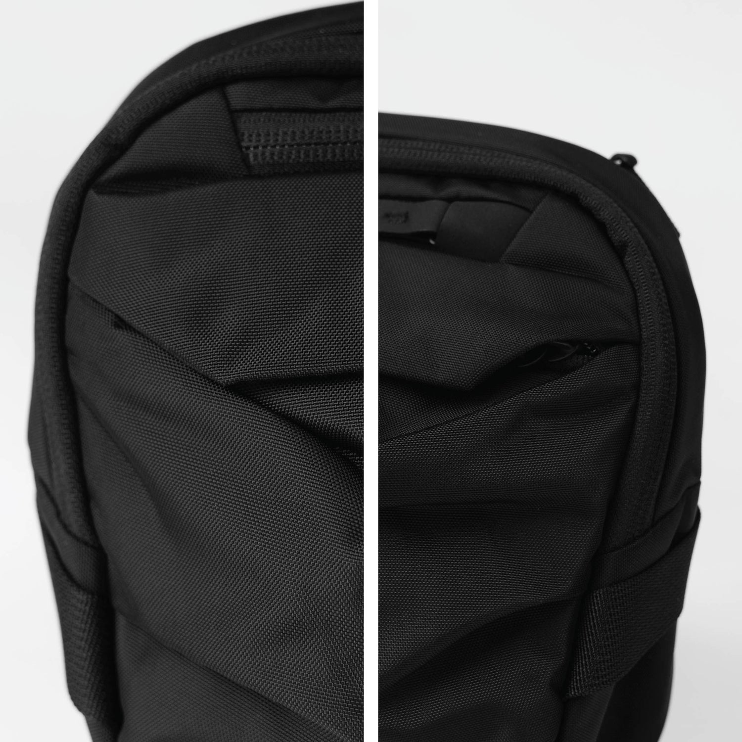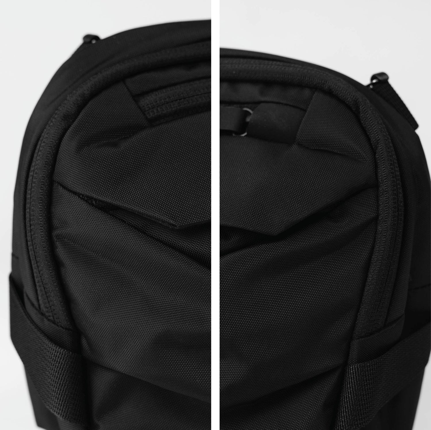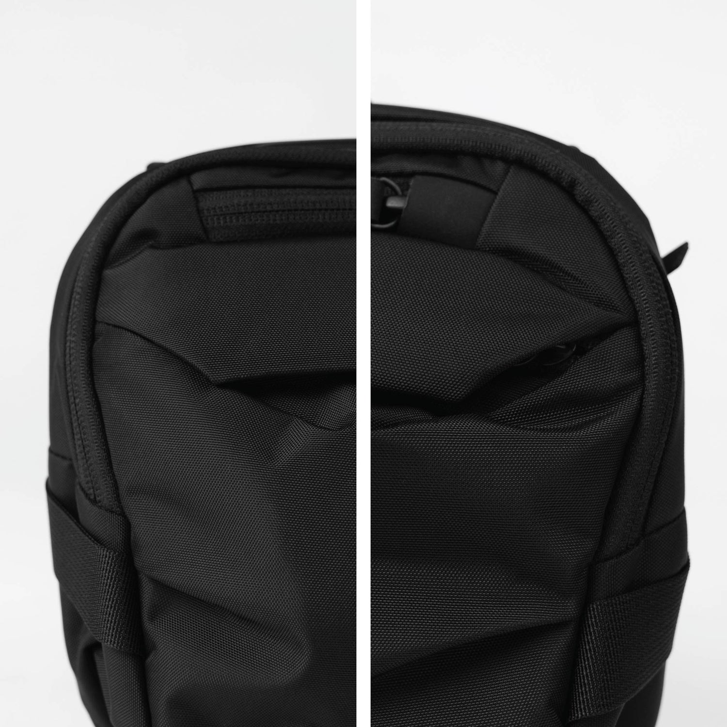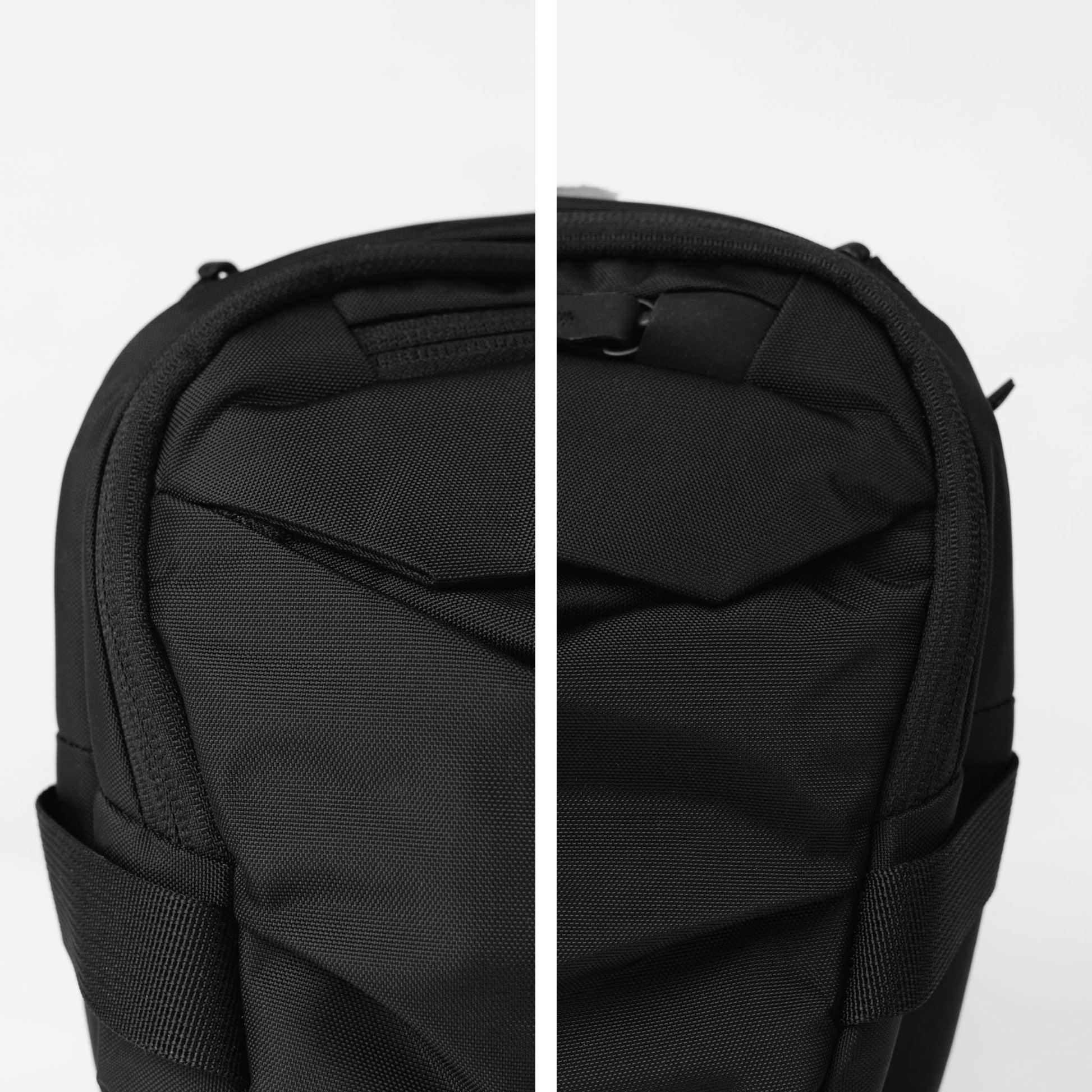 - Slightly crooked panel between top quick access pocket zipper track and main compartment zipper track