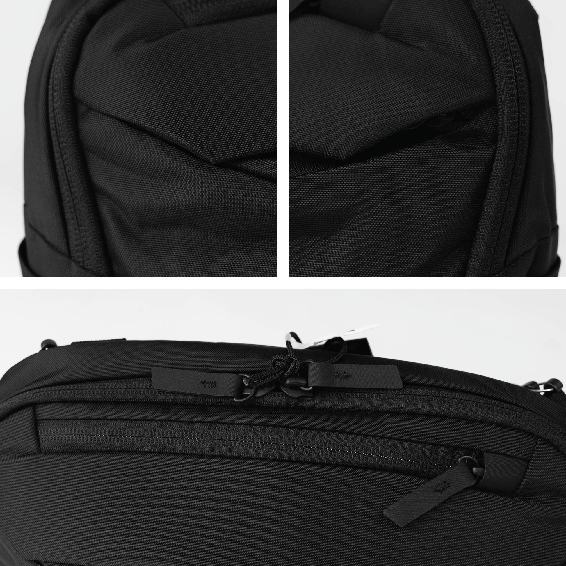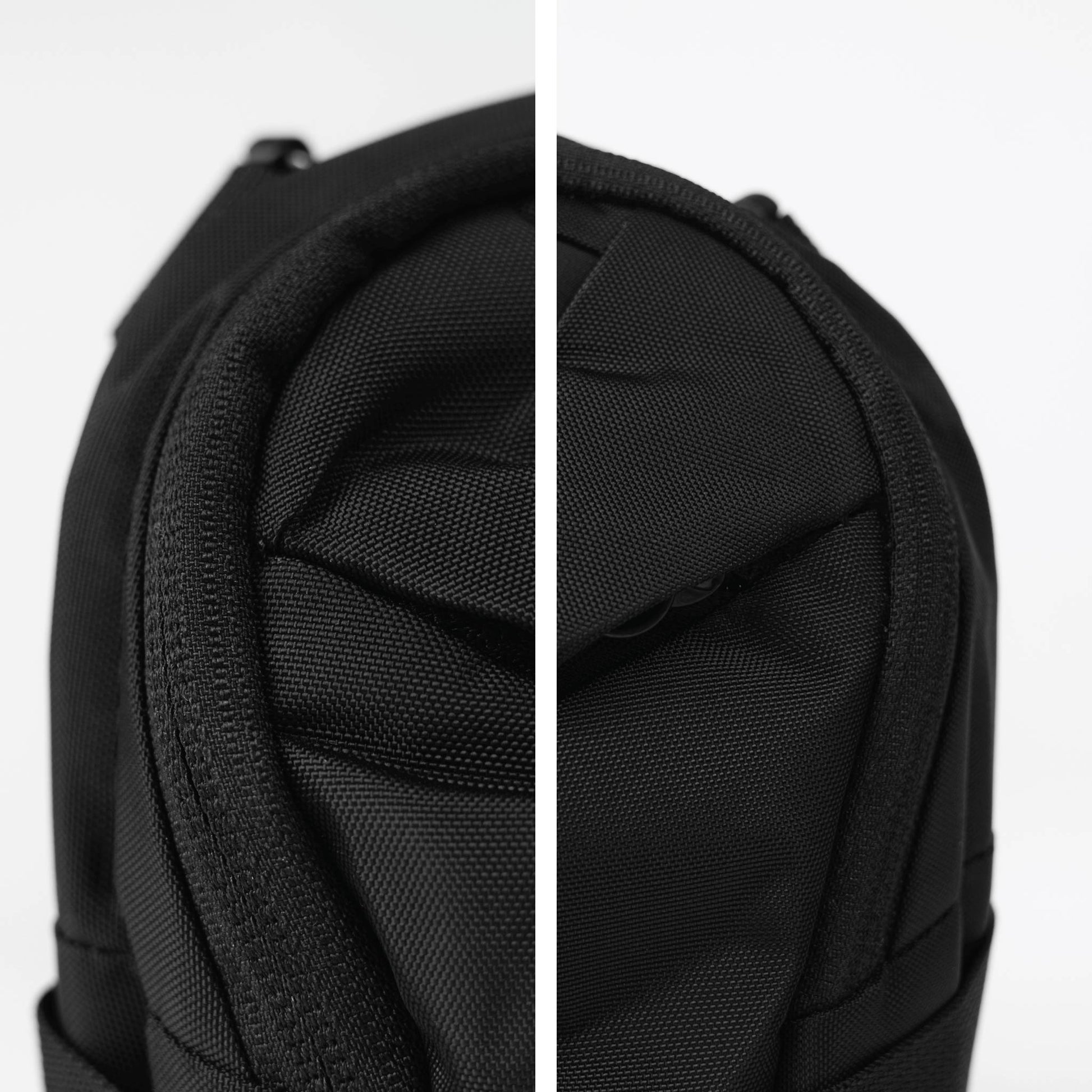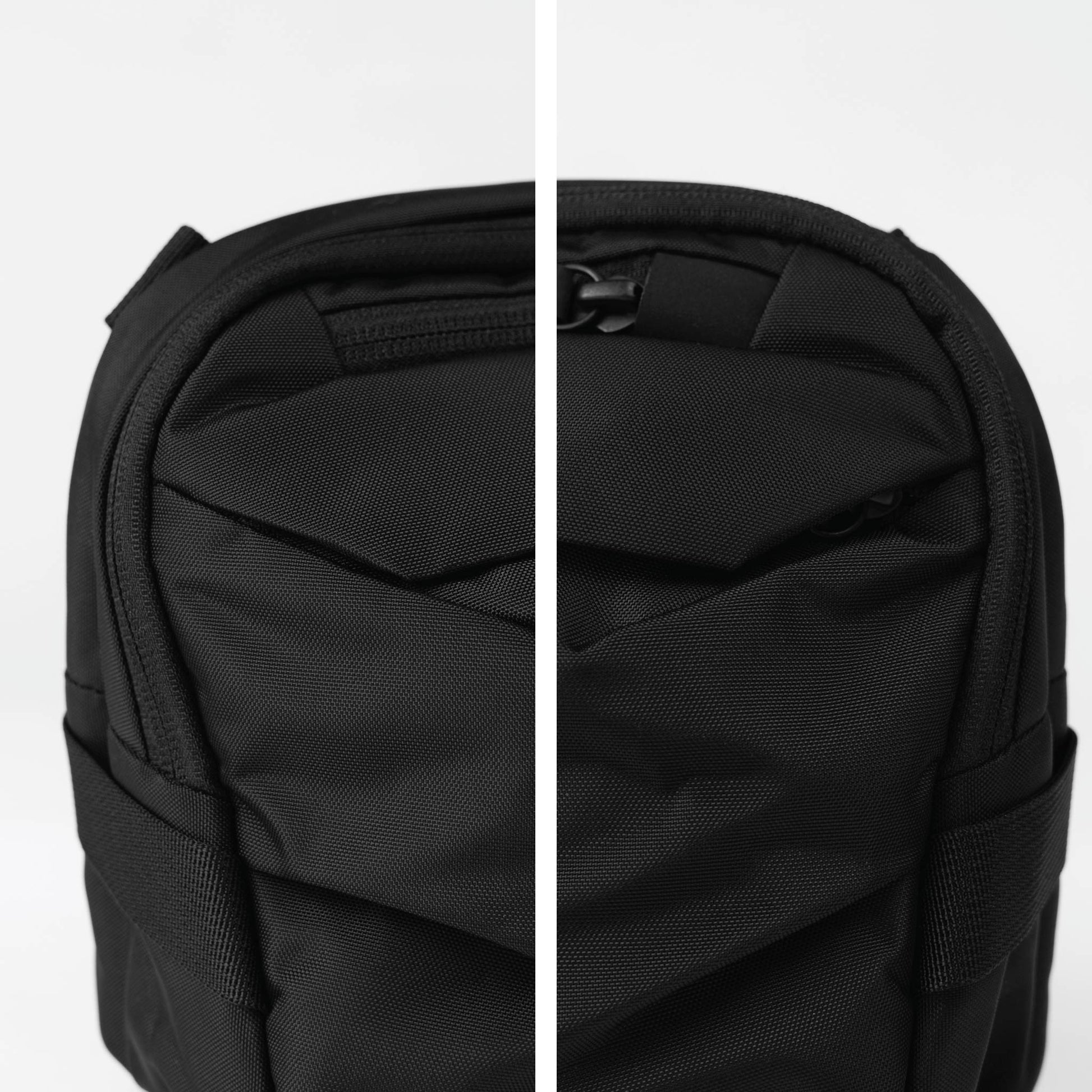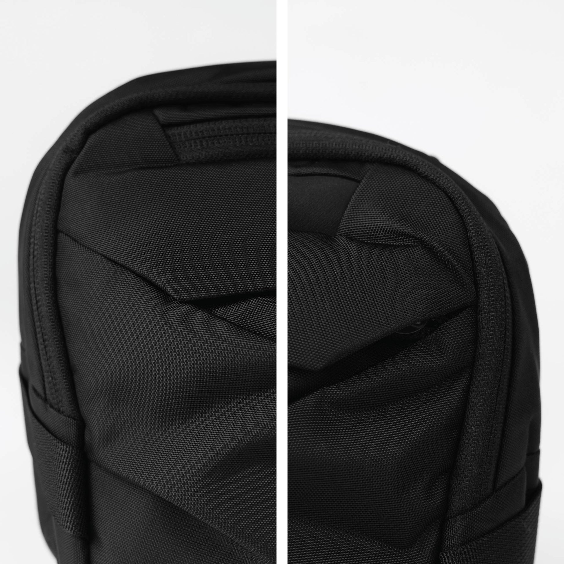- Slightly crooked panel between top quick access pocket zipper track and main compartment zipper track