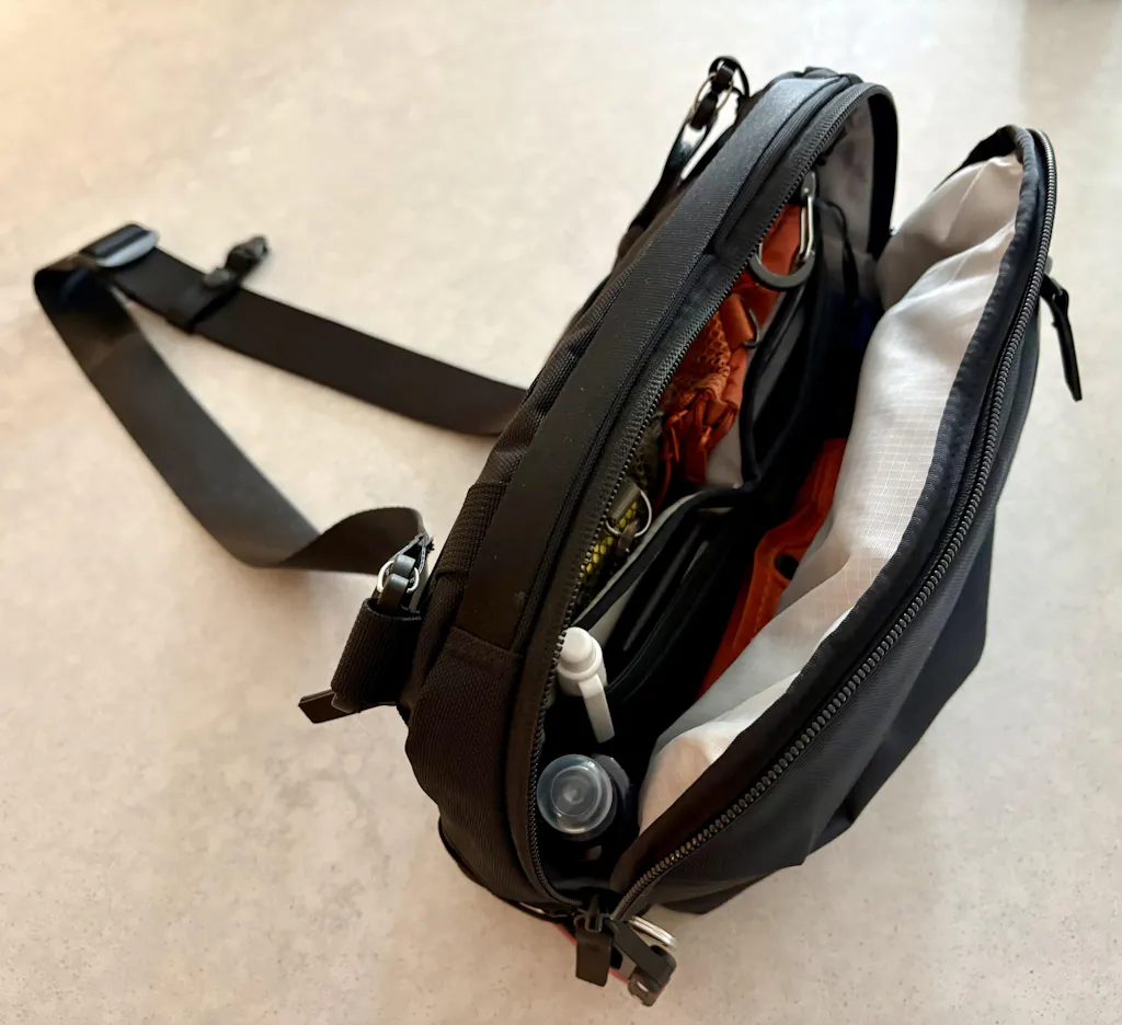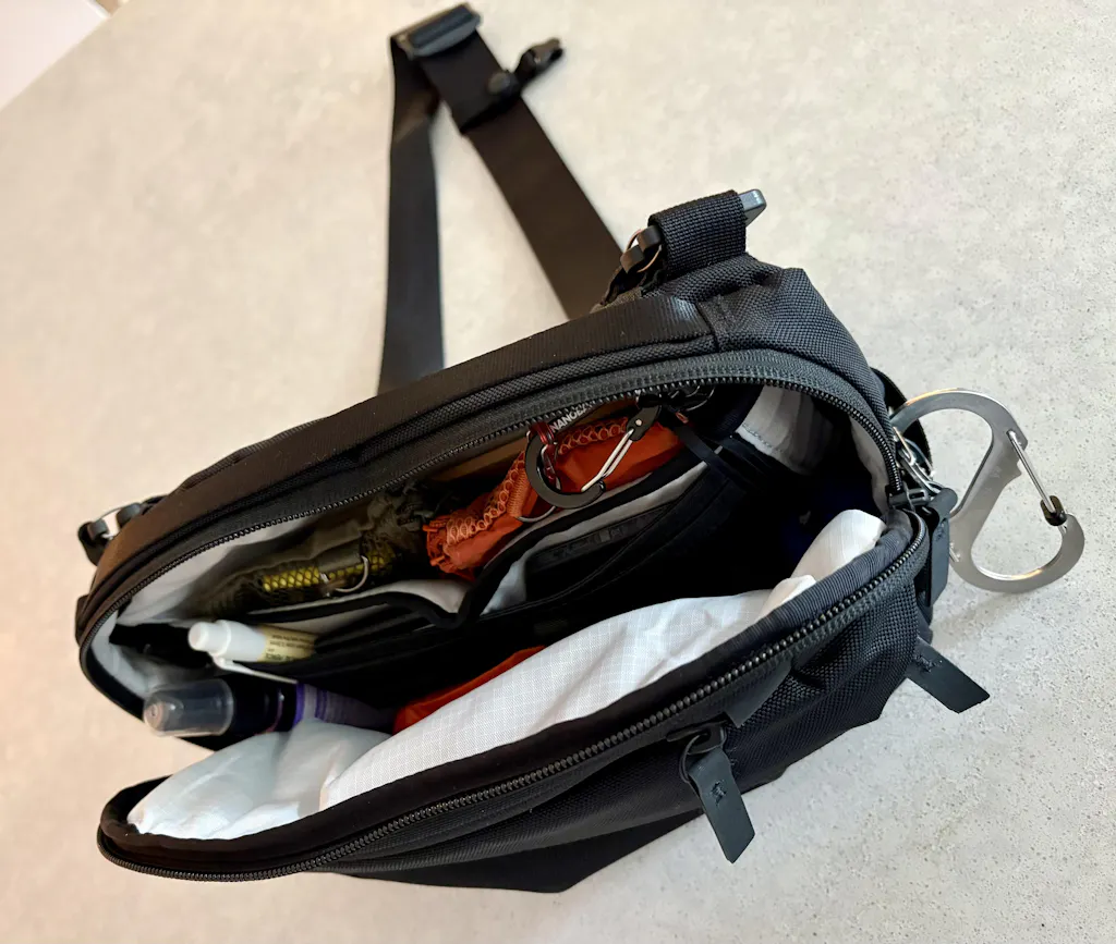 I was really happy to come across the Toshi 5L while researching slings and bought one for a 10-day international trip. It fit 4 passports and 4 boarding passes, two power banks, my wallet, and everything else I needed running though airports. My understanding is that this version has a top handle, which is a great feature that I use all the time, along with the stowable lash straps at the bottom.